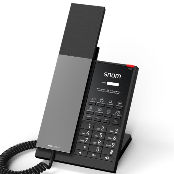 De Snom HD350W valt op door zijn bijzonder duidelijke ontwerp. Belangrijke functietoetsen zoals mute, handsfree en hold bevinden zich op het bedieningspaneel. De antibacteriële behuizing ter bescherming tegen ziektekiemen is een echt pluspunt in het dagelijks leven. Een groot visueel display waarschuwt de gast bij oproepen of wachtende berichten. Individuele opschriften worden als inserts op het bedieningspaneel aangebracht.